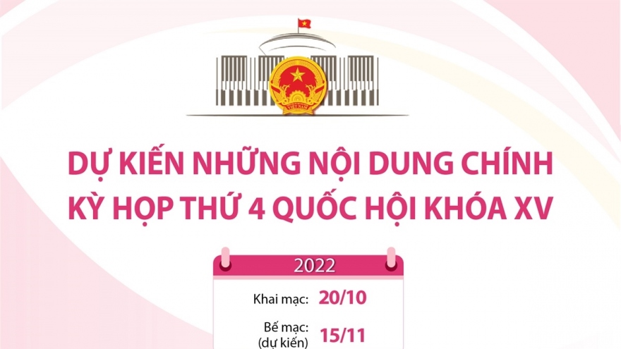 Kỳ họp thứ 4, Quốc hội khóa XV họp phiên trù bị và khai mạc trọng thể vào ngày 20/10/2022, tại Nhà Quốc hội, Thủ đô Hà Nội. Theo dự kiến chương trình, Quốc hội sẽ họp tập trung trong thời gian 21 ngày (dự kiến bế mạc vào ngày 15/11/2022).