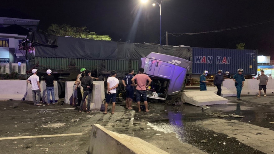 VOV.VN - Sáng 16/2, lực lượng chức năng Công an thị xã Bến Cát, tỉnh Bình Dương xác nhận, đã cùng người dân giải cứu kịp thời tài xế và phụ xe mắc kẹt trong cabin xe container ra ngoài sau tai nạn.