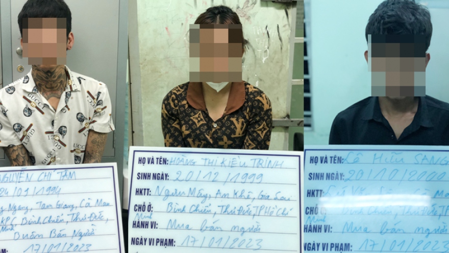 VOV.VN - Công an thành phố Thuận An, tỉnh Bình Dương đang tạm giữ Lê Hữu Sang (23 tuổi, quê Cà Mau) và Hoàng Thị Kiều Trinh (24 tuổi, quê Gia Lai) để điều tra về hành vi mua bán người trái phép.
