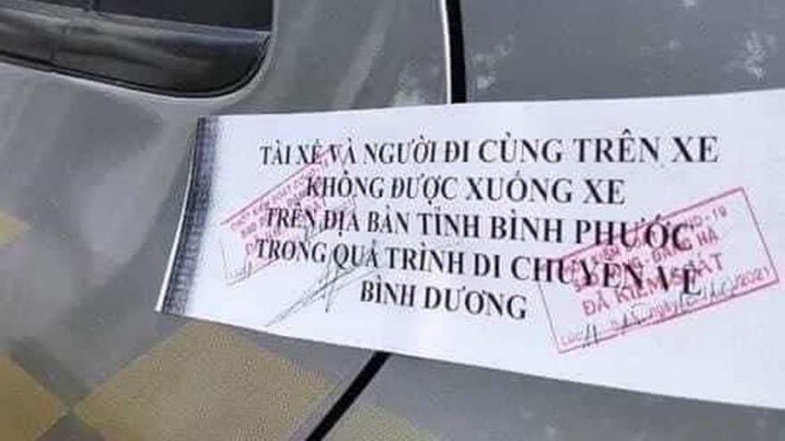 VOV.VN - Chiều nay (16/10), mạng xã hội chia sẻ hình ảnh chiếc ô tô bị chốt kiểm soát dịch Covid-19 dán niêm phong ở cửa xe không cho người đi trên xe xuống dọc đường khi đi qua tỉnh Bình Phước về Bình Dương.