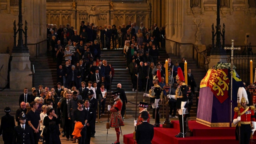 VOV.VN - Ngày 19/9, Vương quốc Anh đã chính thức tổ chức quốc tang mang đậm nét truyền thống, tiễn biệt Nữ hoàng Elizabeth II - vị quân vương trị vì lâu nhất của nước này - về nơi an nghỉ cuối cùng. Khoảng 2.000 người tham dự trực tiếp tang lễ, trong đó có khoảng 500 nhà lãnh đạo trên khắp thế giới.