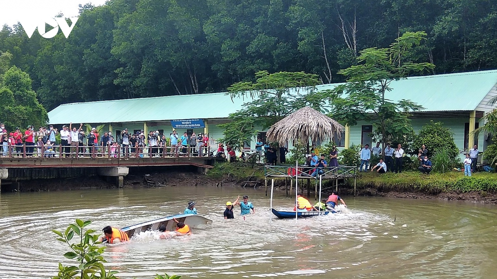 VOV.VN - Chiều 8/10, Giải Kéo co trên xuồng ba lá được UBND huyện Ngọc Hiển tổ chức tại Khu du lịch Quốc gia Mũi Cà Mau. Các đội tham gia tranh tài trong không gian bao quanh bởi những tán rừng đước, mắm ngập mặn đặc trưng của tỉnh Cà Mau, tạo được ấn tượng cho du khách.