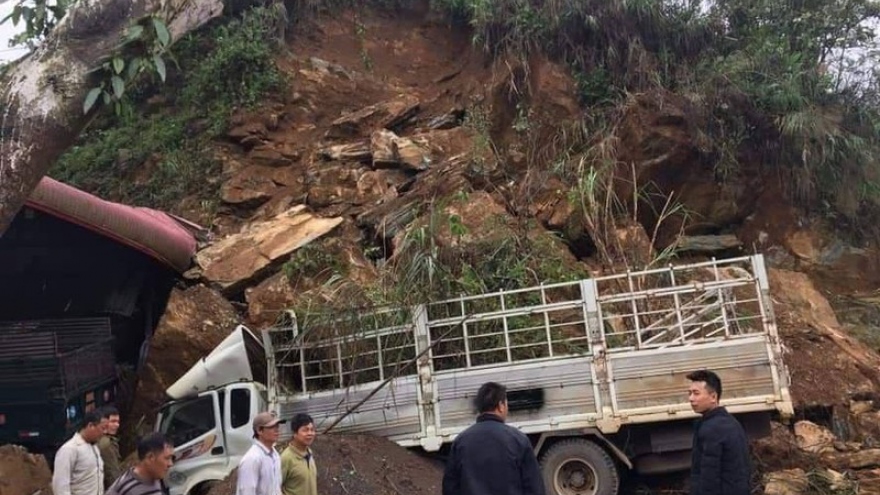 VOV.VN -Tại bản Suối Khem, xã Phiêng Luông, huyện Mộc Châu, tỉnh Sơn La vừa xảy vụ sạt lở đất đá từ trên đồi xuống, khiến 1 chiếc ô tô tải bị hư hỏng nặng.