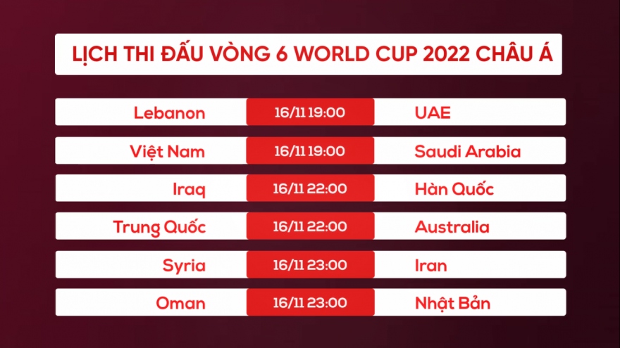VOV.VN - Cập nhật lịch thi đấu lượt trận thứ 6 vòng loại cuối cùng World Cup 2022 khu vực châu Á 2022, ĐT Việt Nam tiếp đón ĐT Saudi Arabia trên sân nhà.