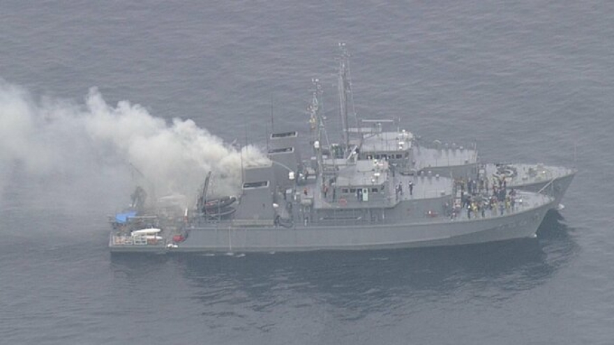 VOV.VN - Như tin đã đưa, từ khoảng 9h48 sáng nay (10/11), một tàu quét mìn của Lực lượng phòng vệ Nhật Bản đã bất ngờ bốc cháy khi đang làm nhiệm vụ trên biển. Hiện nay, hoạt động dập lửa vẫn đang tiếp diễn, nhưng chưa khống chế được đám cháy.