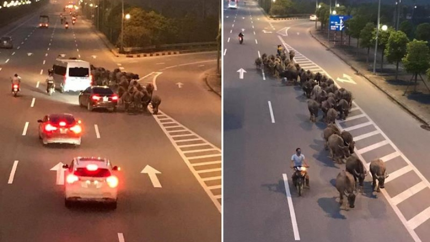 VOV.VN -Người đàn ông dắt đàn trâu gần 50 con đi ngược chiều trên đường cao tốc giữa trời tối khiến nhiều người đi đường giật mình, phải phanh gấp để tránh.