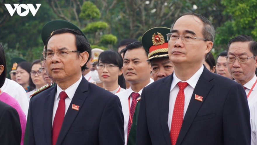 VOV.VN - Tại nghĩa trang Liệt sĩ TPHCM (tại Quận 9), các đại biểu đã thành kính đặt vòng hoa mang dòng chữ “Đời đời ghi nhớ công ơn các Anh hùng liệt sĩ” lên tượng đài Tổ quốc ghi công.