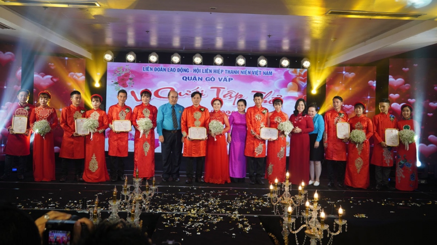 VOV.VN - Trưa nay (4/10), Liên đoàn Lao động quận Gò Vấp (TPHCM) phối hợp với Hội Liên hiệp Thanh niên quận tổ chức lễ cưới tập thể cho 7 cặp đôi là công nhân lao động.