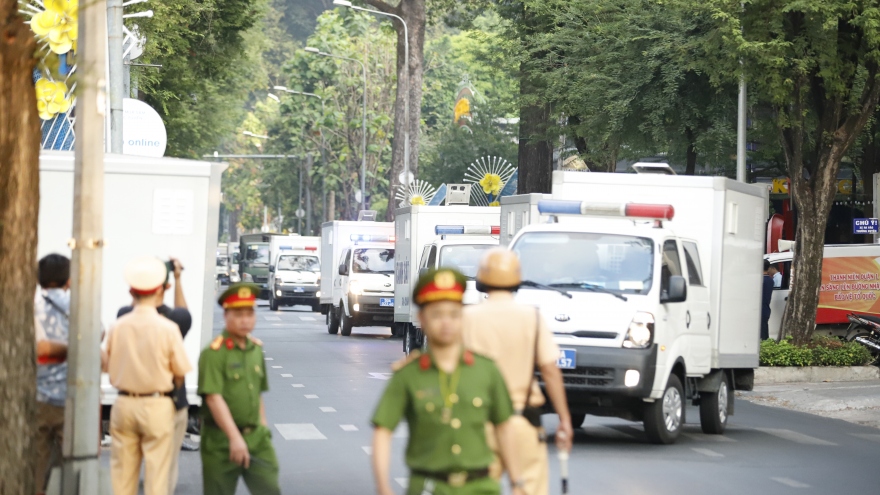 Đoàn xe chuyên dụng chở bị cáo Trương Mỹ Lan và các đồng phạm đến toà