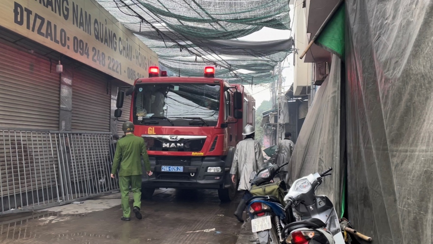 VOV.VN - Trưa 31/12, lực lượng chức năng vẫn tiếp tục phải phun nước để dập tắt những đám cháy nhỏ vẫn còn âm ỉ trong đống vải cháy ở kho vải chợ Ninh Hiệp, xã Ninh Hiệp, huyện Gia Lâm, Hà Nội.