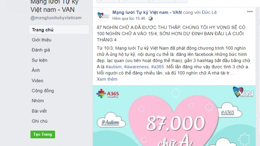 100.000 chữ A ủng hộ trẻ tự kỷ trên Facebook có ý nghĩa gì?VOV.VN - Người dùng mạng xã hội Facebook đang chia sẻ rất nhiều thông tin 100.000 chữ A ủng hộ cho chứng tự kỷ. Thực hư việc này như thế nào?