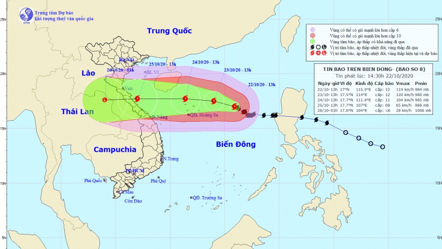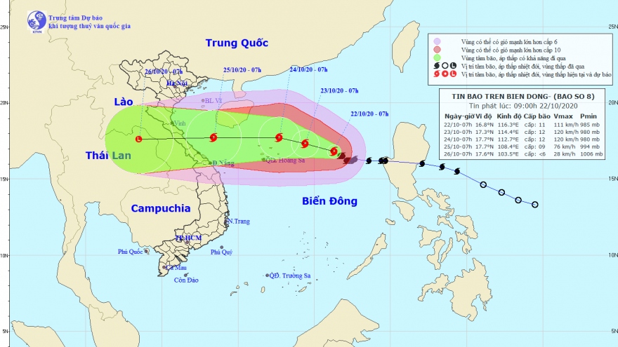 VOV.VN - Hồi 7h ngày 22/10, vị trí tâm bão số 8 mạnh cấp 11 giật cấp 14 ở khoảng 16,8 độ Vĩ Bắc; 116,3 độ Kinh Đông, cách quần đảo Hoàng Sa khoảng 400km về phía Đông.