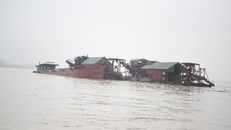 VOV.VN - Lực lượng chức năng bắt giữ 2 tàu cuốc, 2 tàu sang mạn, 4 tàu hút, 4 tàu chở, 3 tàu hút cát cùng 46 thuyền viên đang hút cát trái phép trên sông Hồng thuộc địa bàn giáp ranh giữa Hà Nội và Phú Thọ.