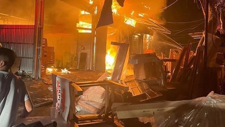 VOV.VN - Vào khoảng 20h35 phút tối 12/12, tại một ngôi nhà 2 tầng làm xưởng gỗ ở thôn Bàn Giữa (xã Hữu Bằng, huyện Thạch Thất, Hà Nội) bất ngờ xảy ra cháy lớn. Lửa và khói bốc lên cuồn cuộn, rồi nhanh chóng cháy lan sang các cửa hàng và nhà xưởng bên cạnh.