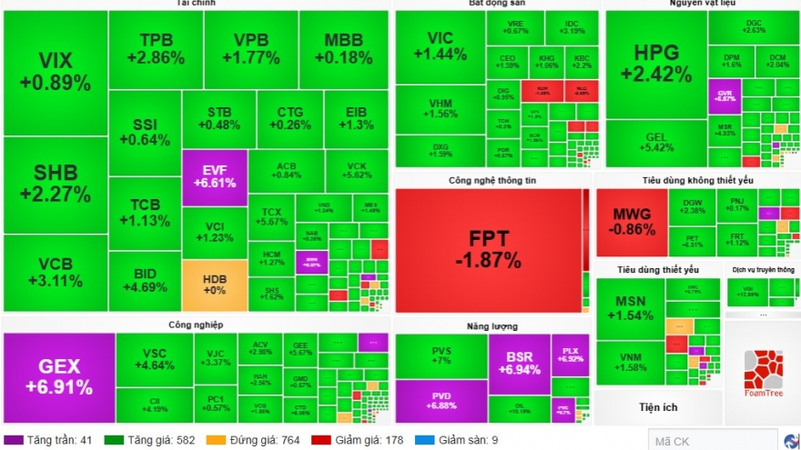 VOV.VN - Phiên giao dịch khai xuân diễn ra đầy hứng khởi khi dòng tiền lan tỏa trên diện rộng, kéo hàng loạt nhóm ngành bứt phá. Sắc xanh áp đảo với số mã tăng gấp nhiều lần mã giảm, giúp VN-Index tăng gần 2%, vượt mốc 1.860 điểm và tạo nền tảng tâm lý tích cực cho chặng đường đầu tư phía trước.