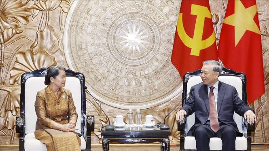 VOV.VN - Chiều 23/3/2026, tại Trụ sở Trung ương Đảng, Tổng Bí thư Tô Lâm tiếp bà Men Sam An, Phó Chủ tịch Đảng Nhân dân Campuchia, Chủ tịch Hội đồng Quốc gia Mặt trận đoàn kết phát triển Tổ quốc Campuchia nhân dịp sang thăm làm việc tại Việt Nam theo lời mời của Chủ tịch Ủy ban Trung ương Mặt trận Tổ quốc Việt Nam.