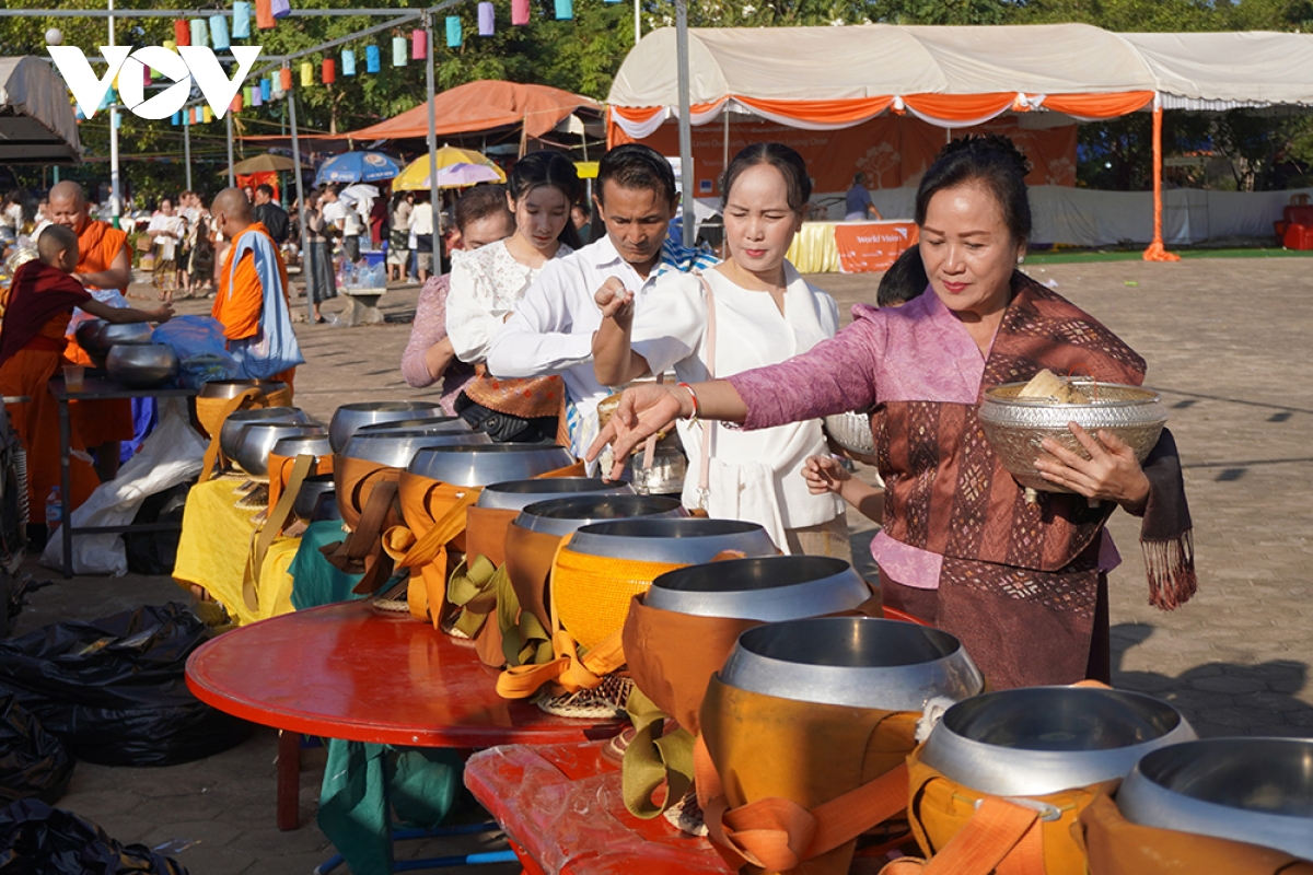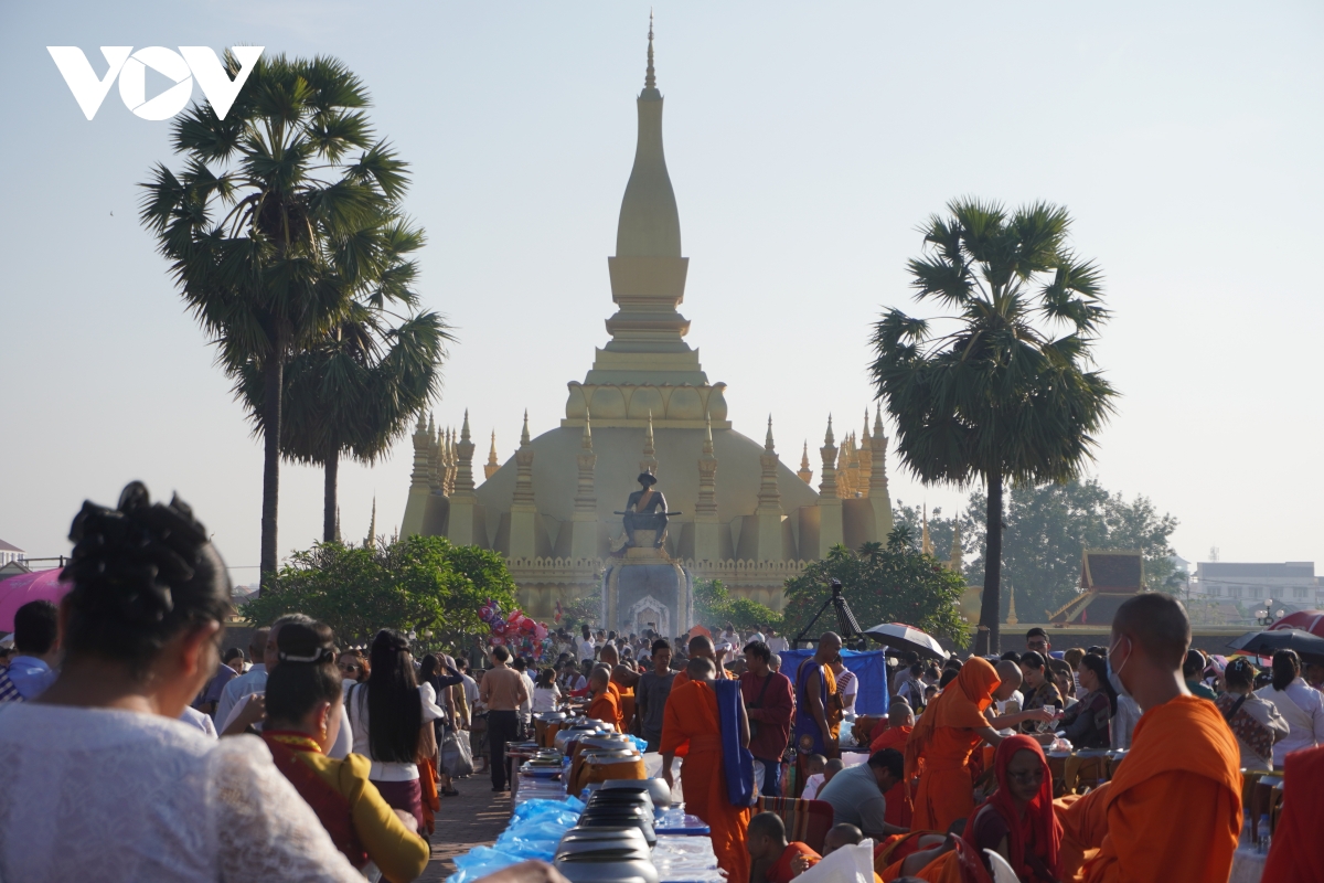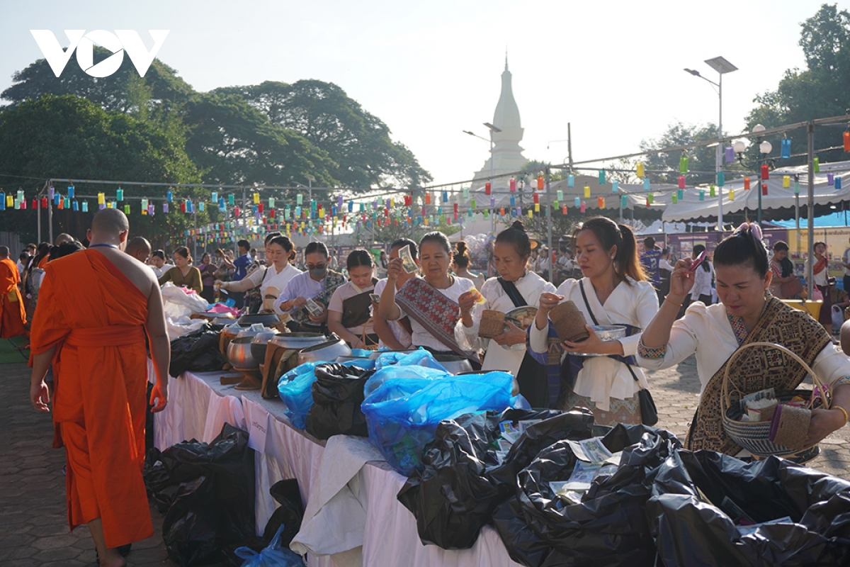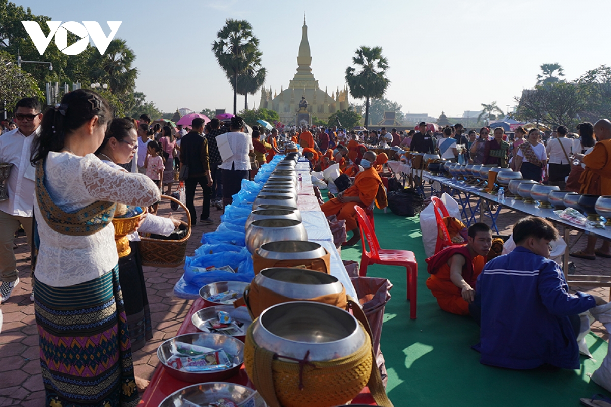 Ngay từ sáng sớm, hàng nghìn chư tăng, phật tử cùng người dân trên khắp nước Lào đã tập trung về khu vực chùa Thatluang – có nghĩa là Tháp lớn ở trung tâm thủ đô Vientiane để thực hiện nghi lễ Xaybath (có nghĩa là cúng dường). Đây là một trong những nghi lễ vô cùng thiêng liêng đối với người dân địa phương và là truyền thống lâu đời diễn ra trong văn hóa Phật giáo Lào nói chung, lễ hội Thatluang nói riêng.