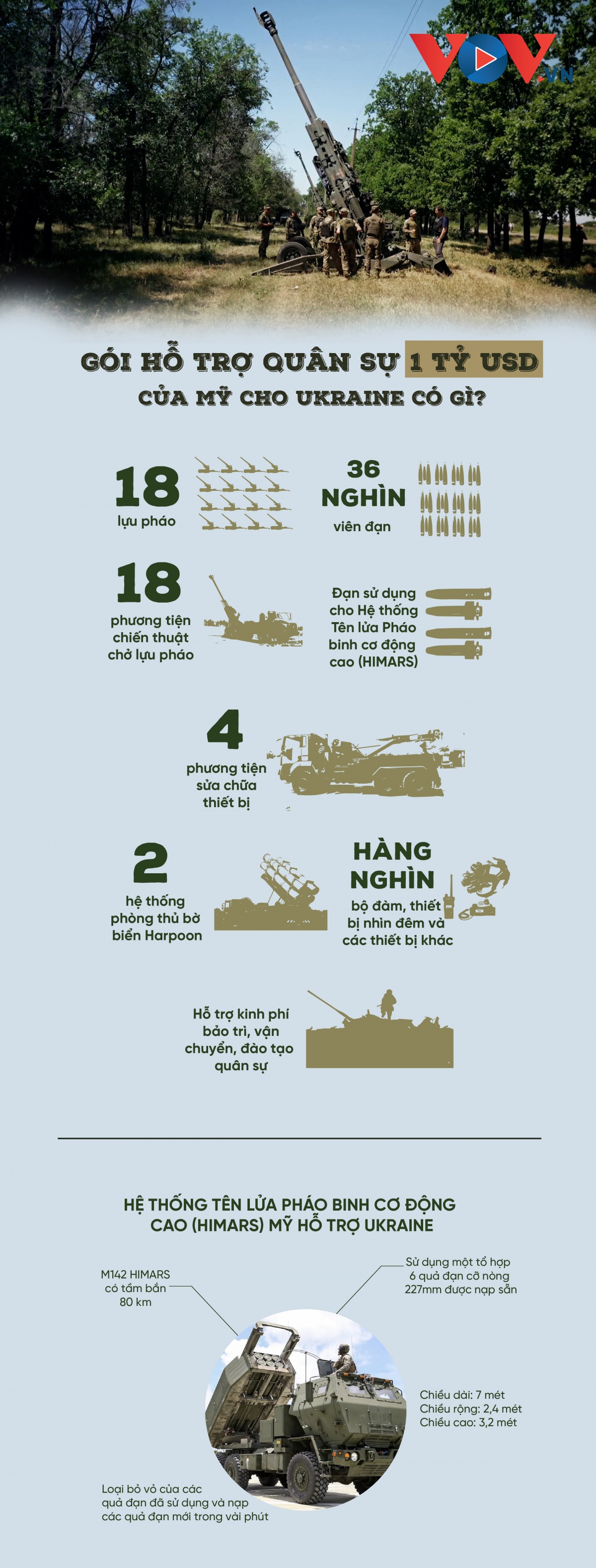 VOV.VN - Dưới đây là những hệ thống vũ khí trong gói hỗ trợ quân sự trị giá 1 tỷ USD Mỹ cung cấp cho Ukraine ngày 15/6, nâng tổng số tiền Mỹ hỗ trợ Ukraine kể từ đầu cuộc chiến lên xấp xỉ 5,6 tỷ USD.