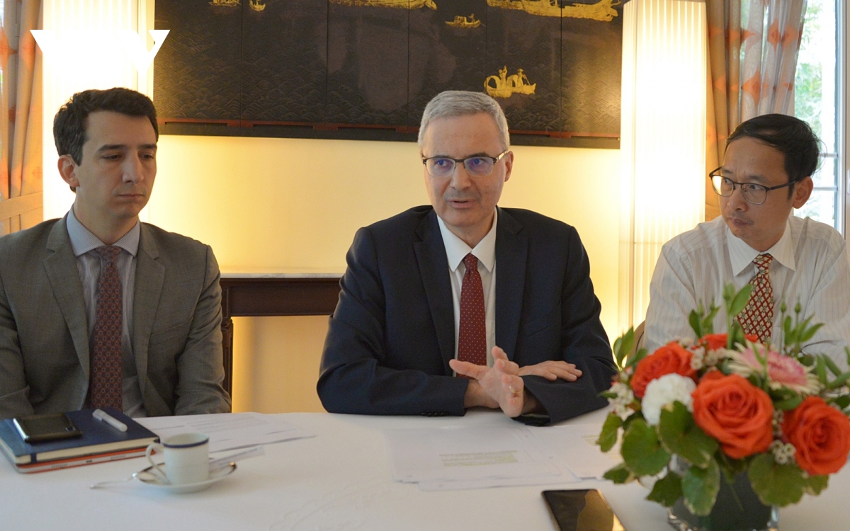 Đại sứ Pháp tại Việt Nam Nicolas Warnery (giữa) trao đổi với các phóng viên Việt Nam hôm 23/2. Ảnh: Trung Hiếu.