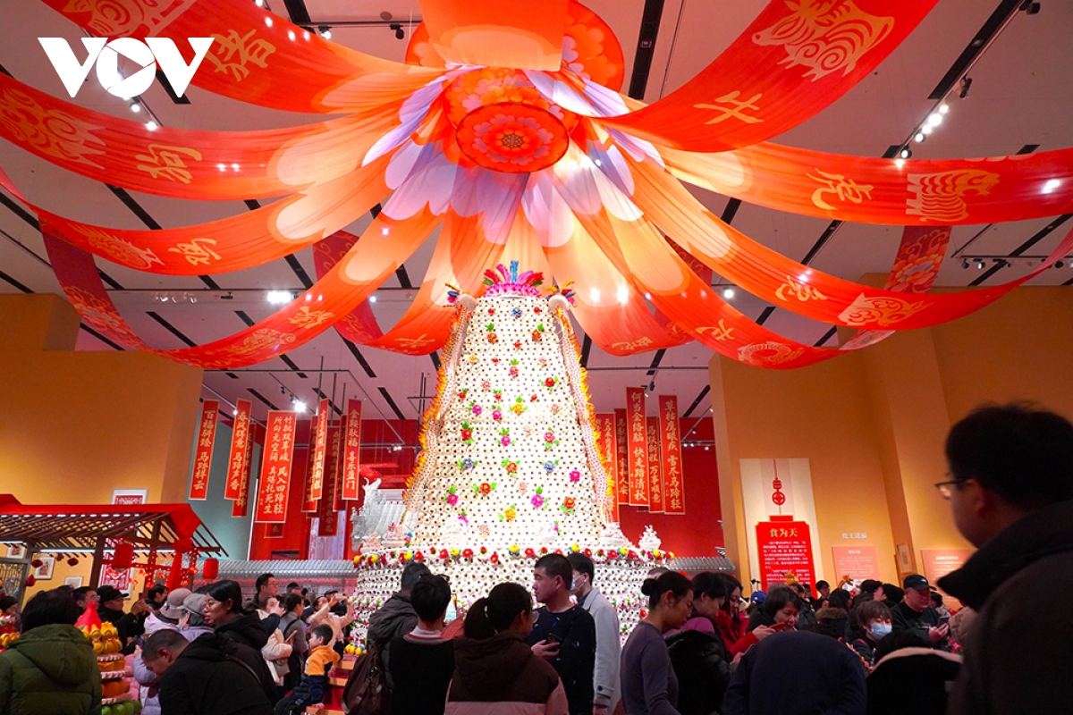 Ở giữa triển lãm là chiếc màn thầu hoa hay hoa bột mì (Huamo) khổng lồ, cao 4,5 mét, đường kính 3,6 mét, vô cùng bắt mắt và là điểm “check-in” không thể bỏ qua của khách tham quan.