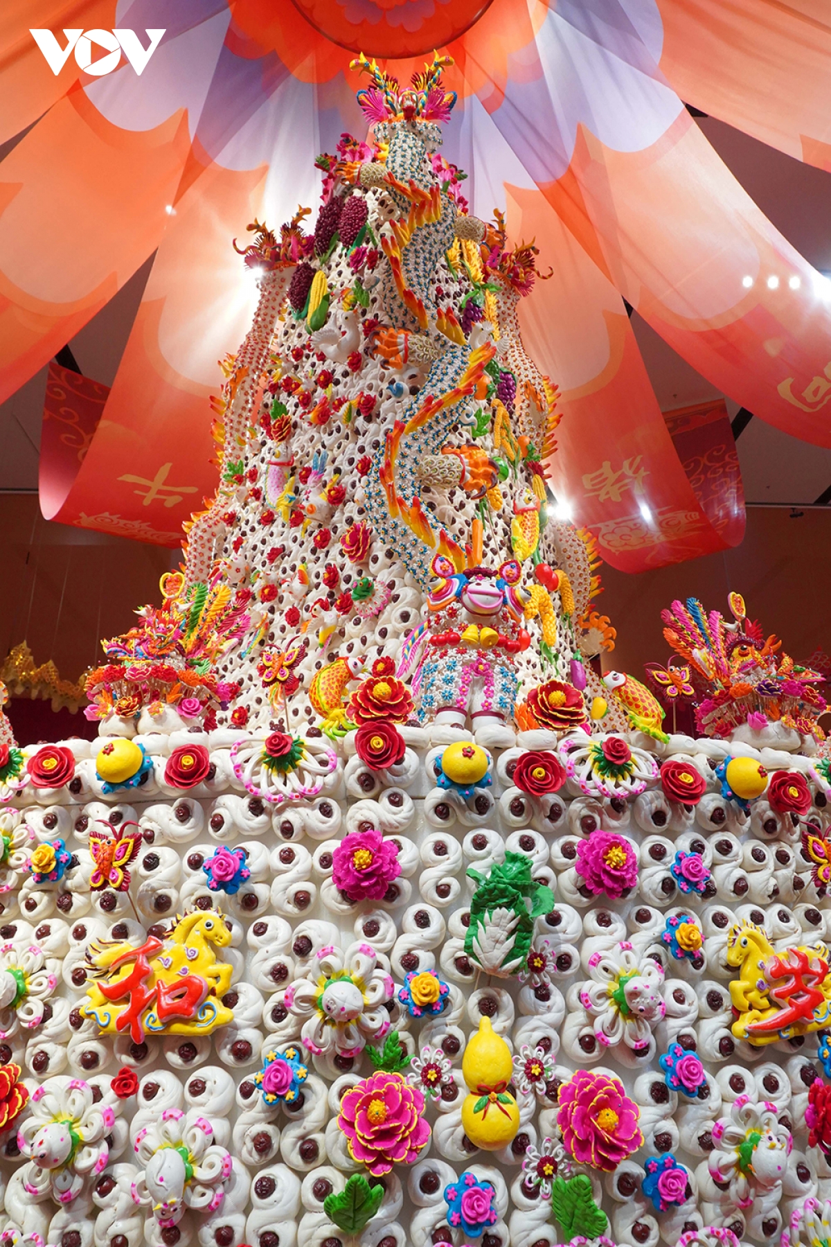 Đây là tác phẩm màn thầu hoa Trừng Thành (Chengcheng), một di sản văn hóa phi vật thể tiêu biểu của tỉnh Thiểm Tây, miền Trung Trung Quốc. Tác phẩm đặc biệt này dựa trên quan niệm “Trời tròn đất vuông”, kết hợp nhiều yếu tố phong phú của hoa và 12 con giáp. Tác phẩm do 18 người làm hoàn toàn thủ công trong khoảng một tháng.