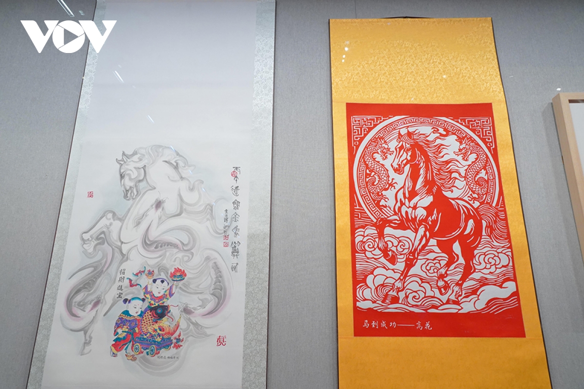 Năm nay là năm Ngựa, triển lãm cũng dành riêng một khu giới thiệu về con giáp này thông qua các tác phẩm di sản văn hóa phi vật thể như tranh cắt giấy, tranh Tết, múa rối bóng, gốm sứ, chạm khắc đá, chạm khắc da, đan tre và tượng đất sét.