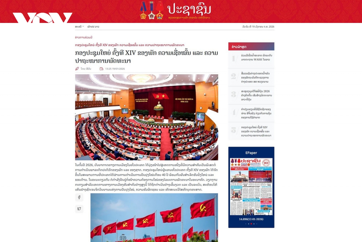 Trang nhất báo Paxaxon, Cơ quan ngôn luận của Đảng Nhân dân Cách mạng Lào hôm nay (19/1) đăng bài viết “Đại hội lần thứ XIV Đảng Cộng sản Việt Nam diễn ra từ ngày 19 - 25 tháng 1”, bài báo có đoạn: “Với chủ đề: Dưới lá cờ vẻ vang của Đảng, chung sức, đồng lòng thực hiện thắng lợi các mục tiêu phát triển đất nước đến năm 2030; tự cường, tự tin tiến mạnh trong kỷ nguyên vươn mình của dân tộc, vì hòa bình, độc lập, dân chủ, giàu mạnh, phồn vinh, văn minh, hạnh phúc, vững bước đi lên chủ nghĩa xã hội”.