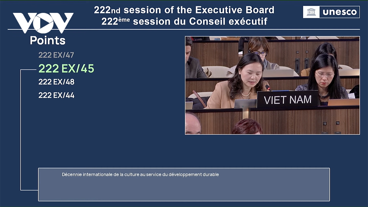VOV.VN - Ngày 15/10, tại Trụ sở của Tổ chức Giáo dục, Khoa học và Văn hóa của Liên hợp quốc (UNESCO) ở Paris, Kỳ họp lần thứ 222 Hội đồng chấp hành UNESCO đã nhất trí thông qua sáng kiến của Việt Nam đề nghị Liên hợp quốc xem xét công bố “Thập kỷ quốc tế về Văn hóa vì phát triển bền vững” sớm nhất có thể.