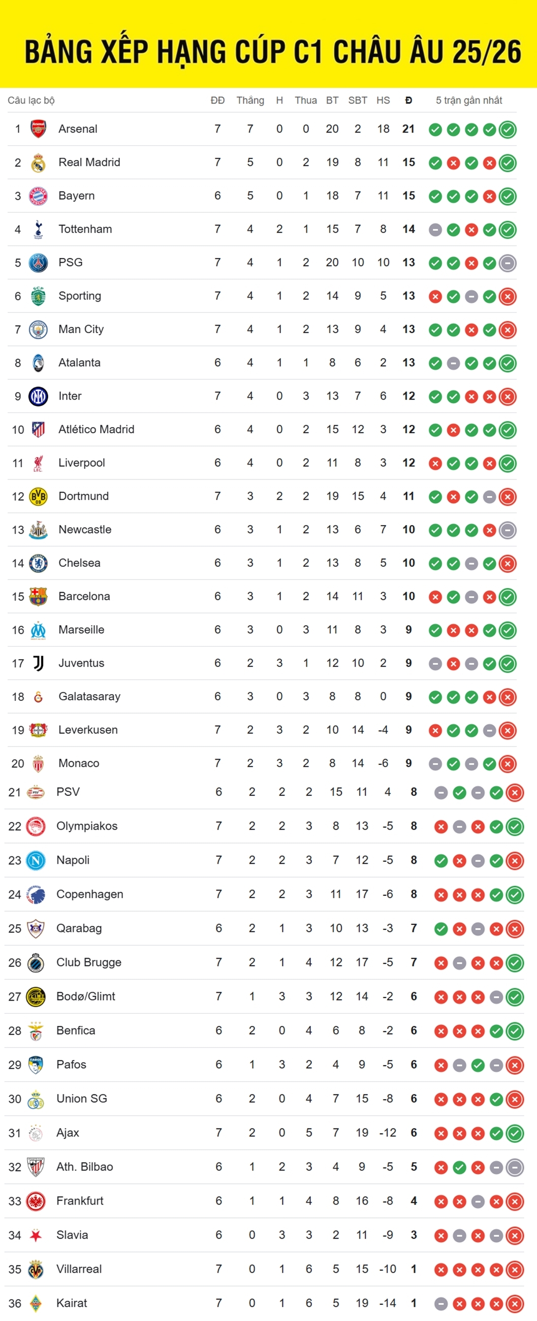 Bảng xếp hạng Cúp C1 châu Âu mới nhất: Xác định đội đầu tiên vào vòng 1/8 là Arsenal. Ngoài ra, 7 đội bóng khác là Real Madrid, Bayern Munich, Tottenham, PSG, Sporting, Man City, Atalanta cũng đã chắc chắn vượt qua vòng bảng nhưng vẫn còn khả năng phải đá loạt trận play-off.
