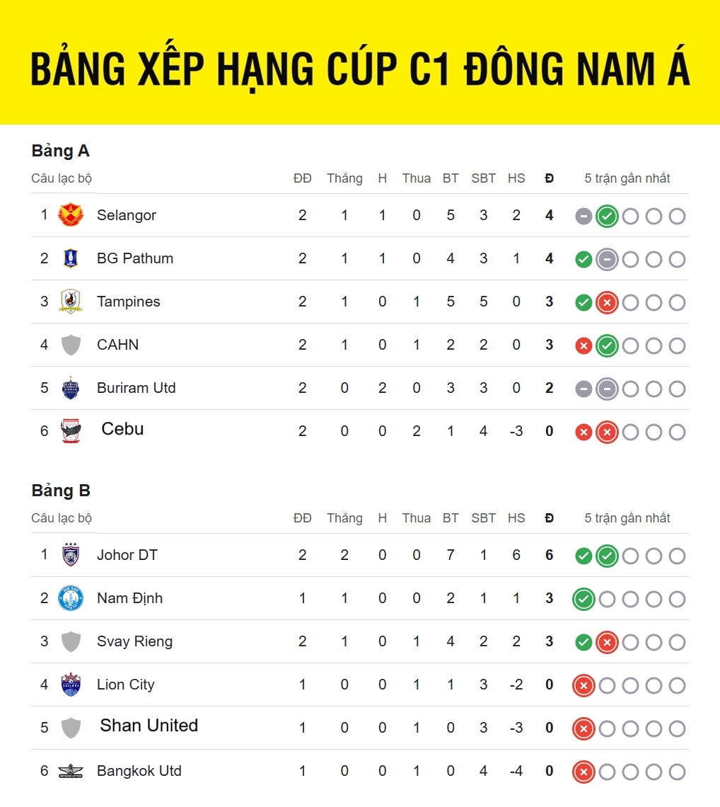 Bảng xếp hạng Cúp C1 Đông Nam Á 2025/2026 mới nhất: Nam Định áp sát đội bóng mạnh của Malaysia là Johor sau chiến thắng nhọc nhằn trước Svay Rieng. Đại diện V-League có 3 điểm, kém đối thủ 3 điểm nhưng thi đấu ít hơn 1 trận.