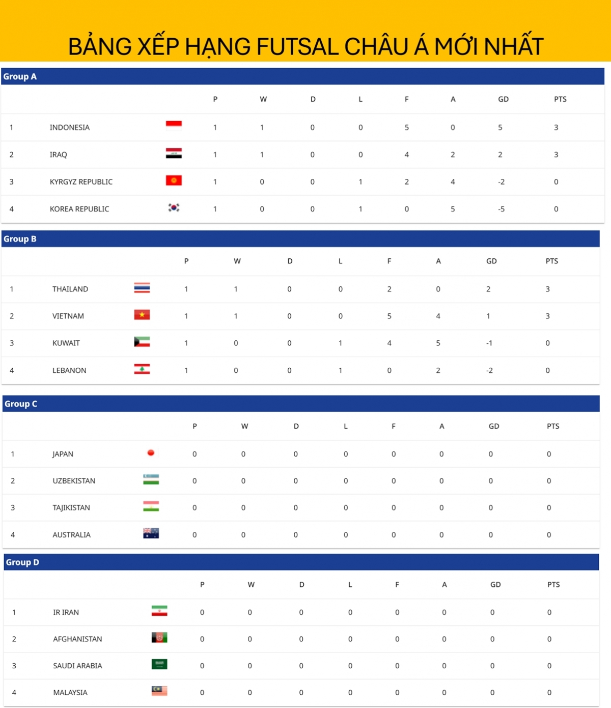 Bảng xếp hạng Futsal châu Á 2026 mới nhất cập nhật sáng 28/1, ĐT Việt Nam tạm xếp sau Thái Lan sau trận ra quân ở bảng B. Trong khi đó, ĐT Indonesia đang có vị trí đầu bảng A sau chiến thắng đậm 5-0 trước Hàn Quốc.