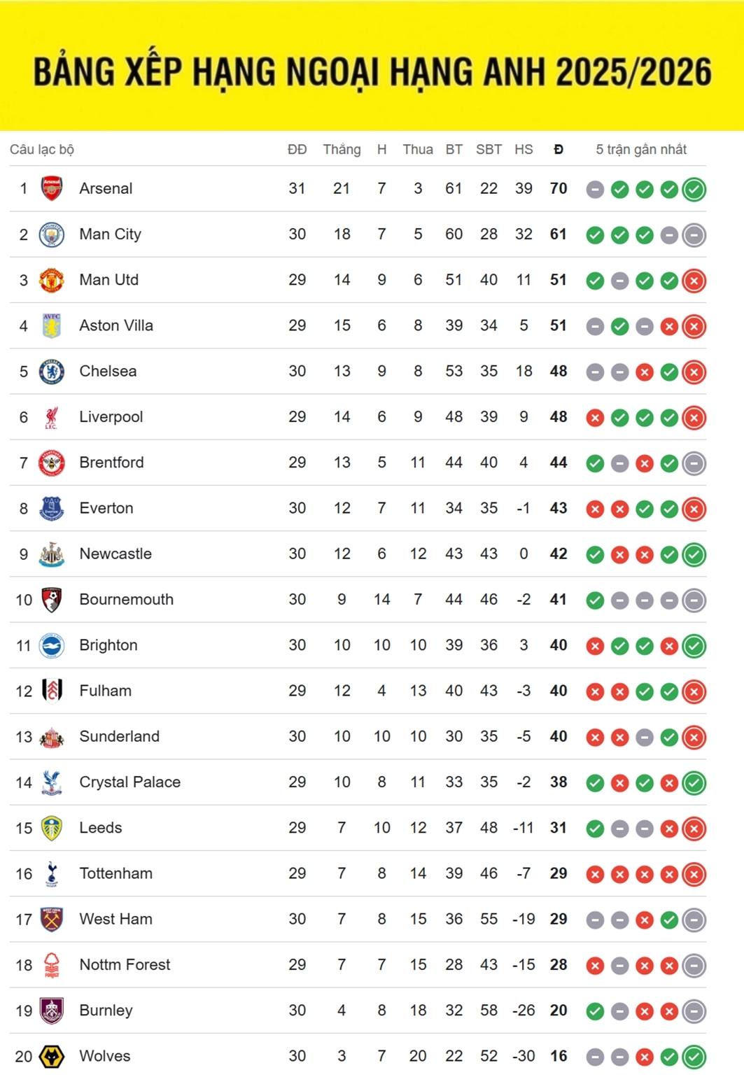 Bảng xếp hạng Ngoại hạng Anh 2025/2026 mới nhất, cập nhật sáng 15/3: Arsenal tạm hơn Man City 9 điểm sau những trận đá sớm vòng 30. Pháo thủ đánh bại Everton 2-0 trong khi Man City bị West Ham cầm hòa với tỷ số 1-1.