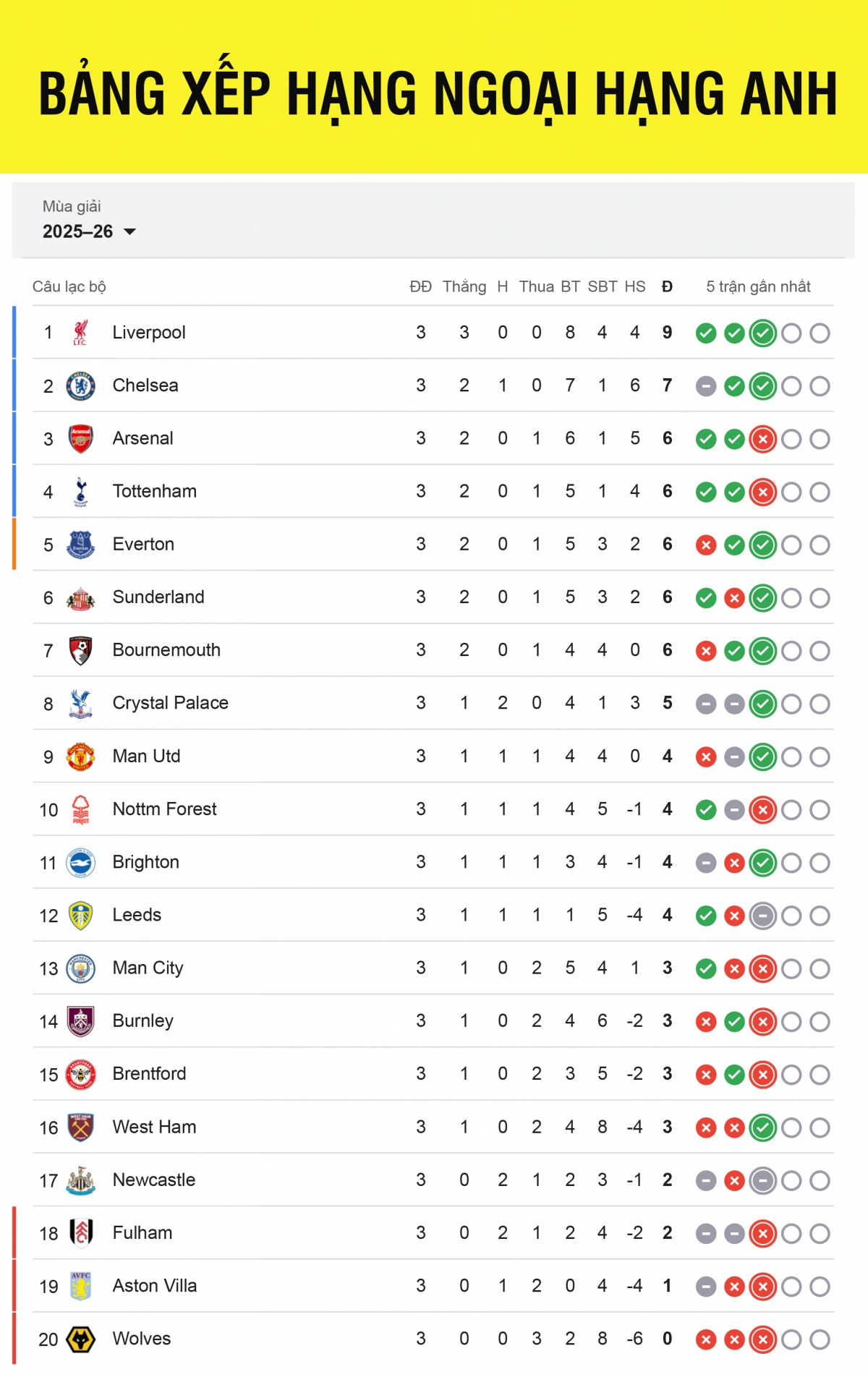 Liverpool giành chiến thắng 1-0 trước Arsenal ở trận cầu tâm điểm vòng 3 Ngoại hạng Anh 2025/2026. Chiến thắng này giúp Lữ đoàn đỏ vượt qua chính đối thủ để dẫn đầu bảng xếp hạng sau 3 vòng đấu.