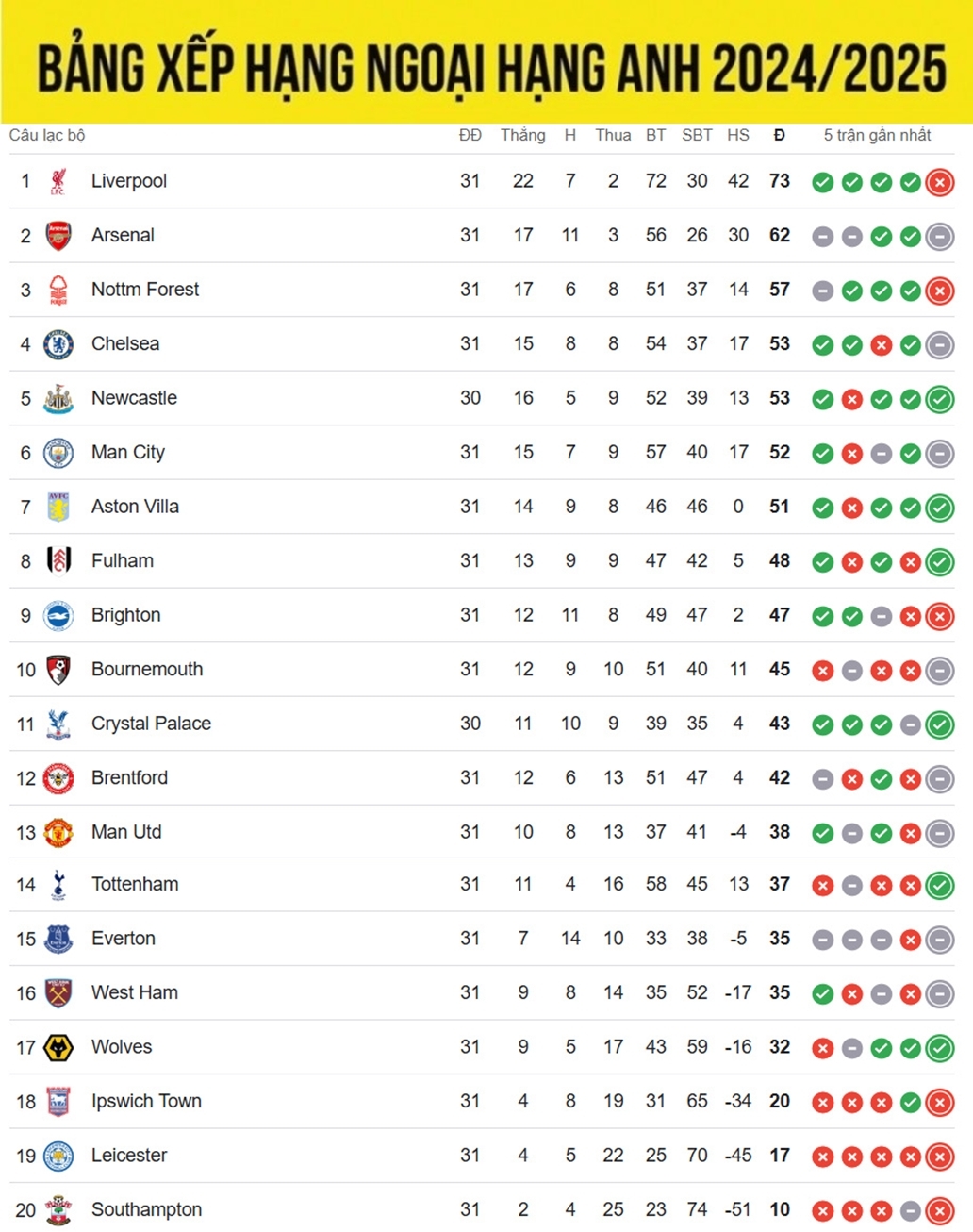 Bảng xếp hạng Ngoại hạng Anh mới nhất cập nhật sáng 8/4, Liverpool dẫn đầu và có khoảng cách 11 điểm với đội nhì bảng Arsenal. Newcastle áp sát tốp 4 khi đã có bằng điểm số với Chelsea sau chiến thắng 3-0 trước Leicester City, đồng thời đẩy Man City xuống vị trí thứ 6.
