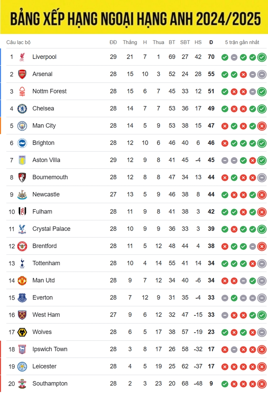 Bảng xếp hạng Ngoại hạng Anh mới nhất cập nhật sáng 10/3/2025. MU chưa thoát khỏi nhóm cuối dù vừa có trận hòa với Arsenal. Quỷ đỏ hiện có 34 điểm sau 28 vòng đấu, xếp hạng 14. Nếu West Ham thắng trong trận đá muộn, MU sẽ rớt xuống hạng 15.