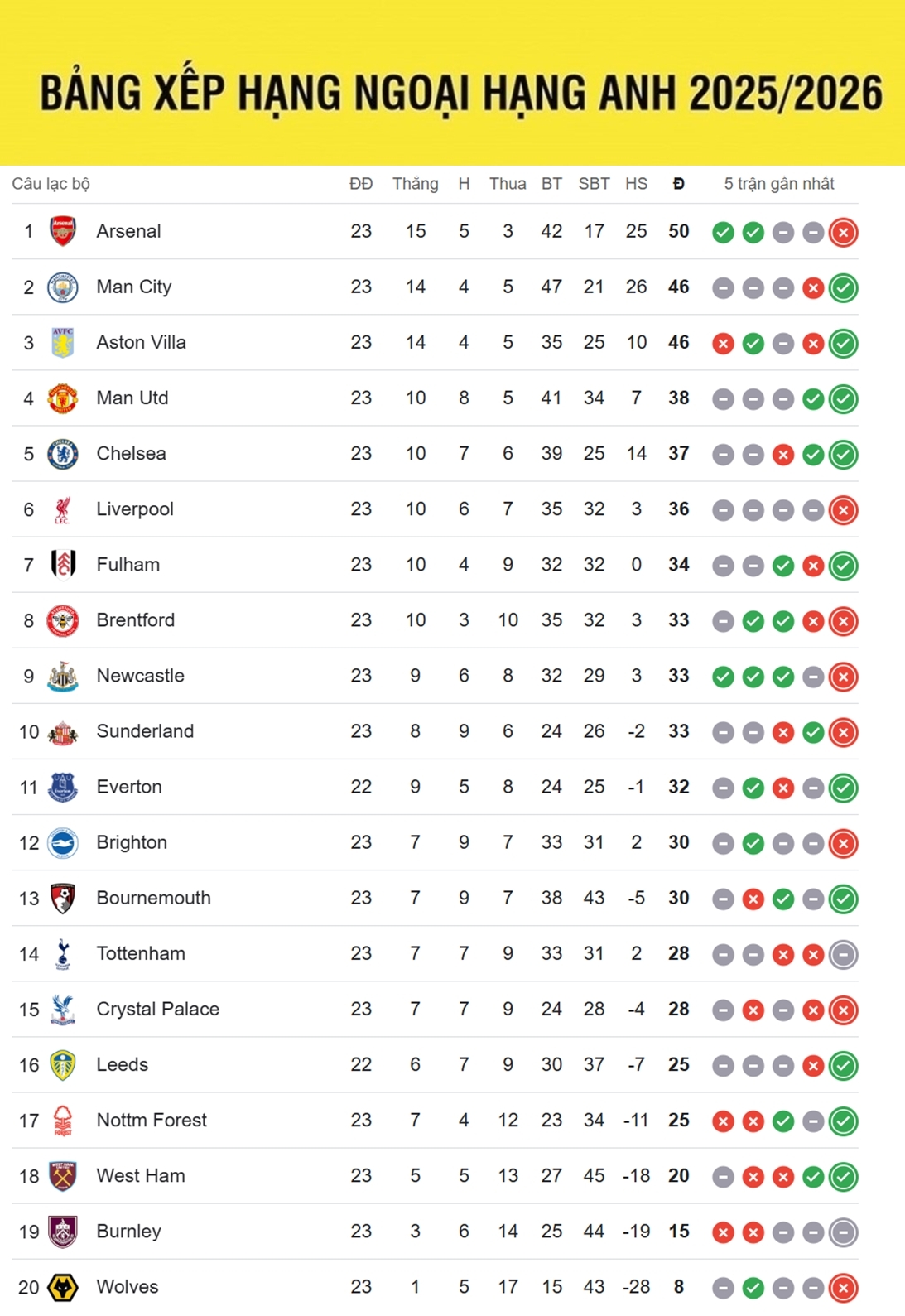 Bảng xếp hạng Ngoại hạng Anh mới nhất, cập nhật sáng 26/1, MU vào tốp 4 sau trận thắng Arsenal 3-2. Quỷ đỏ có 38 điểm, hơn Chelsea và Liverpool lần lượt 1 và 2 điểm. Trong khi đó, Arsenal vẫn giữ ngôi đầu nhưng chỉ còn hơn Aston Villa và Chelsea 4 điểm.