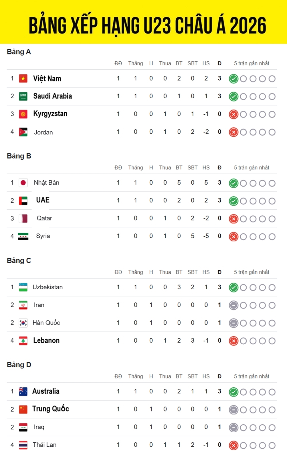 Bảng xếp hạng U23 châu Á 2026 mới nhất, cập nhật sấng 9/1: U23 Việt Nam vẫn duy trì ngôi đầu bảng A khi có 3 điểm sau chiến thắng đầu tiên. Trong khi đó, U23 Thái Lan tạm xếp cuối bảng D với việc chưa có điểm nào sau trận thua Australia.