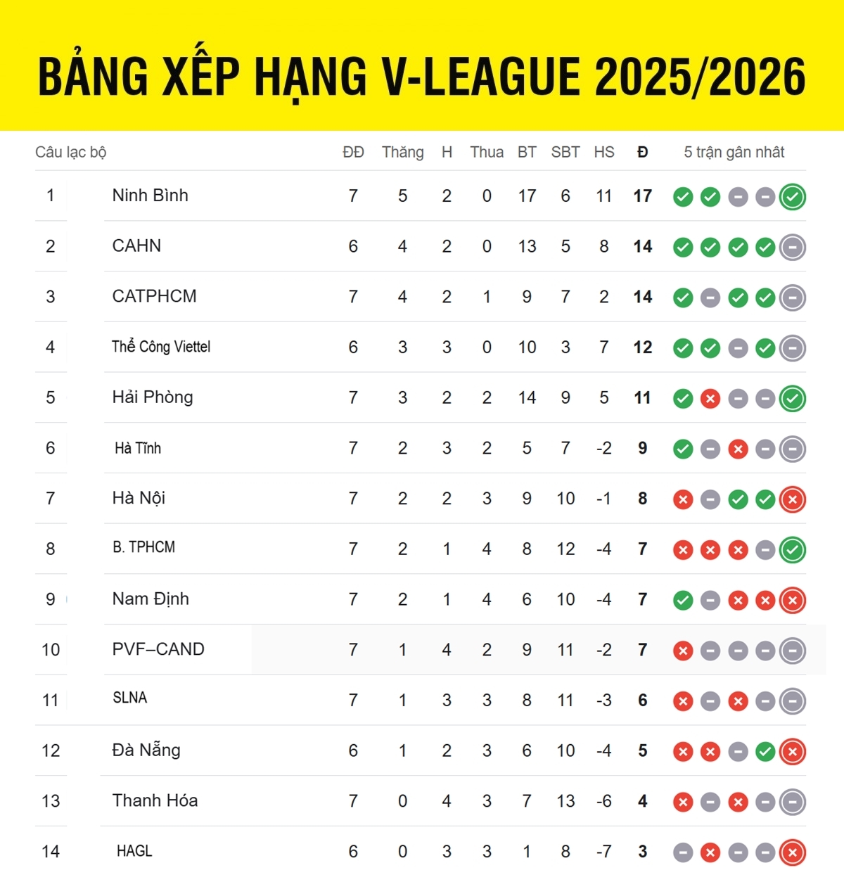 Bảng xếp hạng V-League mới nhất cập nhật sáng 20/10, nhóm đầu căng thẳng với khoảng cách không quá xa trong khi HAGL đang tạm thời xếp cuối với vỏn vẹn 3 điểm.