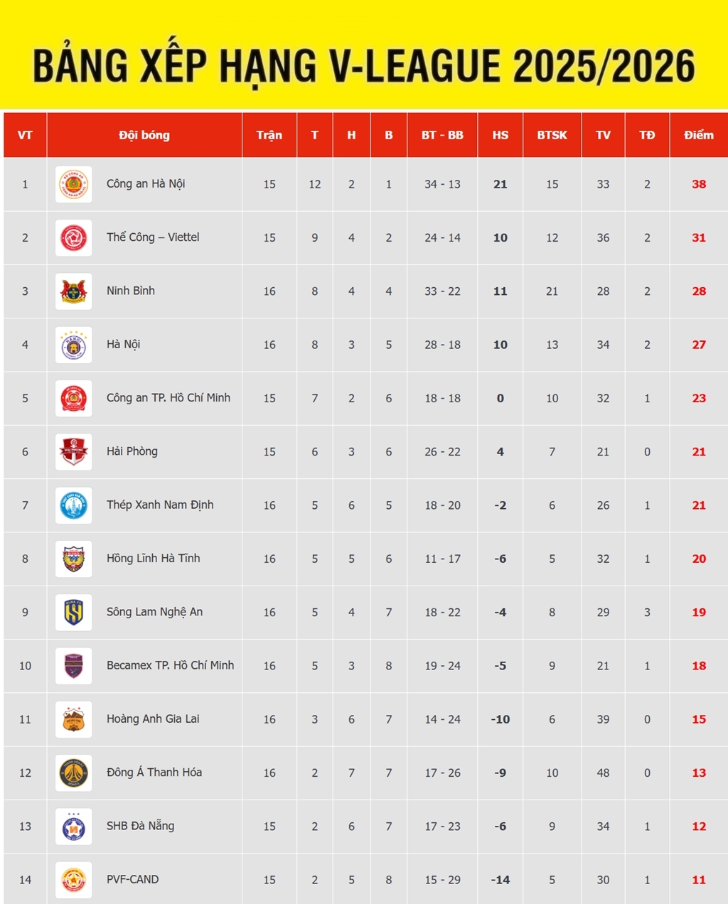 VOV.VN - Bảng xếp hạng V-League mới nhất, CLB CAHN vững vàng ở ngôi đầu trong khi CLB Ninh Bình thất thế rõ rệt ở cuộc đua cho chức vô địch.