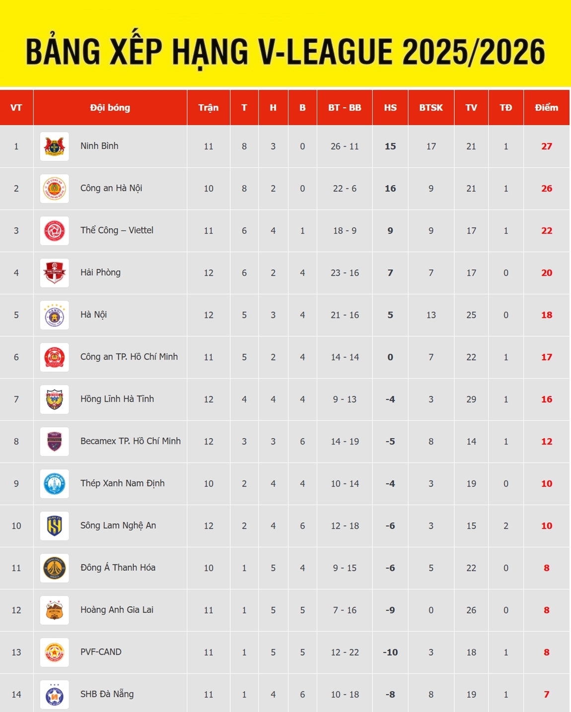 Bảng xếp hạng V-League mới nhất, cập nhật sáng 1/2, Thể Công Viettel lọt vào tốp ba sau chiến thắng trên sân của Hải Phòng FC. Trong khi đó, Hà Nội FC cũng tạm thời vươn lên vị trí thứ năm sau khi đánh bại SLNA.
