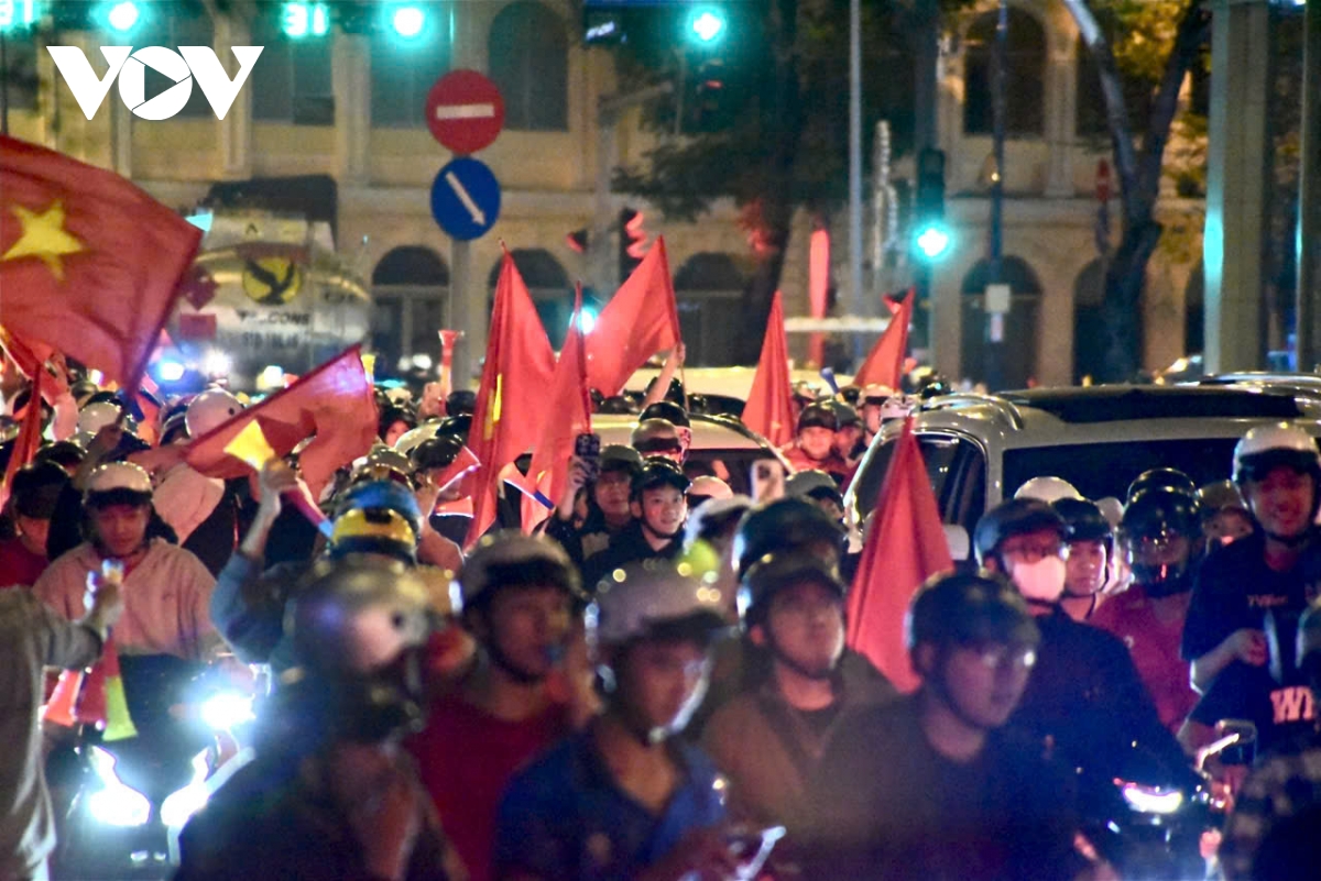 Ngay sau tiếng còi mãn cuộc, hàng loạt tuyến đường trung tâm TP.HCM như Nguyễn Huệ, Lê Lợi, Nam Kỳ Khởi Nghĩa, Điện Biên Phủ,...nhanh chóng rực đỏ màu cờ Tổ quốc. Dòng người đổ ra đường ngày một đông, tiếng hò reo, trống, kèn cổ động vang lên không ngớt, tạo nên một đêm ăn mừng cuồng nhiệt.