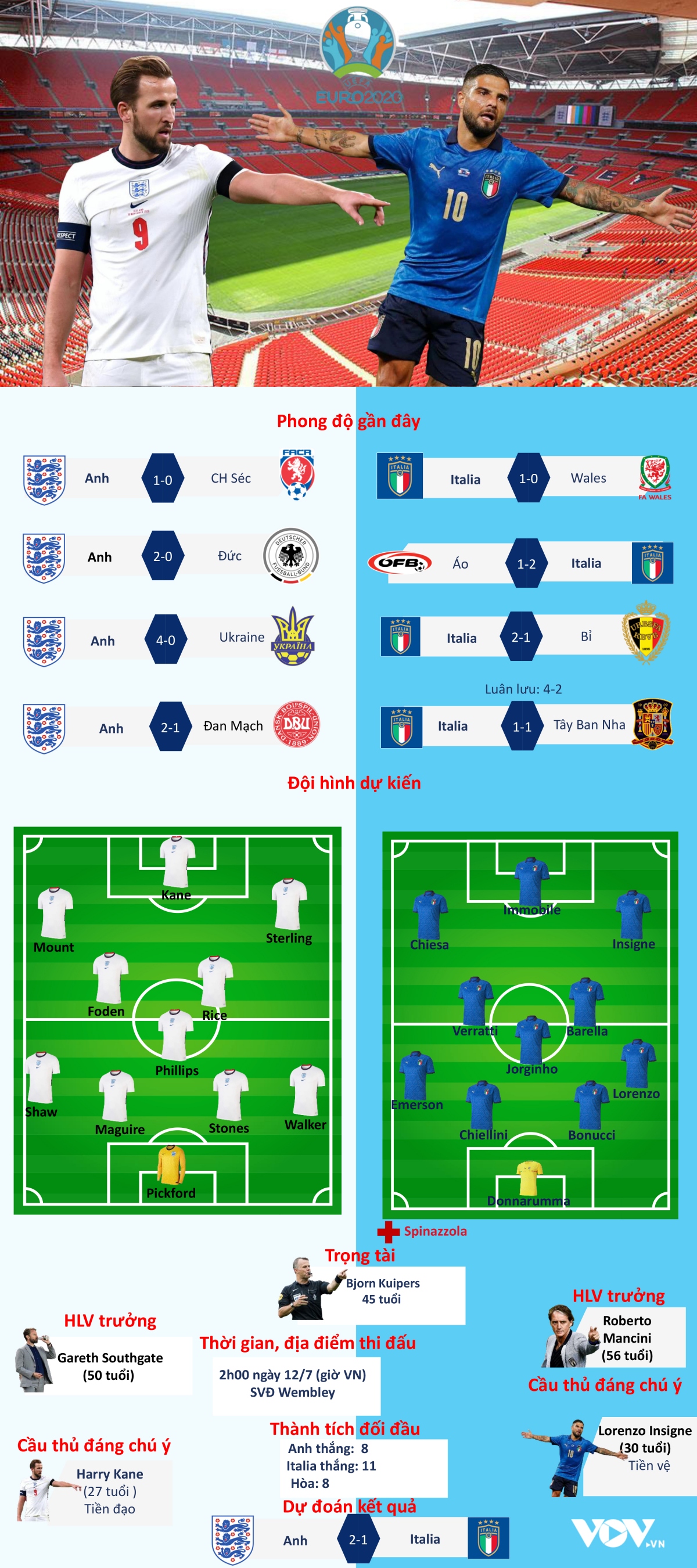 VOV.VN - Dự đoán tỷ số, đội hình xuất phát trận đấu Anh vs Italia, chung kết EURO 2021 diễn ra lúc 2h ngày 12/7 theo giờ Việt Nam.