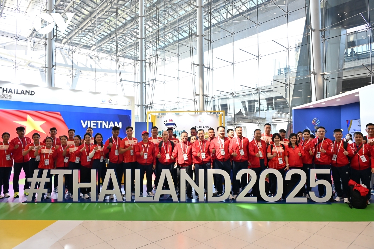 VOV.VN - Trưa 7/12, Đoàn Thể thao Việt Nam đã có mặt tại sân bay quốc tế Suvarnabhumi (Bangkok), chính thức bắt đầu hành trình tham dự SEA Games 33, trong sự chào đón nồng nhiệt của Ban tổ chức SEA Games 33, đại diện Đại sứ quán Việt Nam tại Thái Lan cùng đông đảo người hâm mộ.