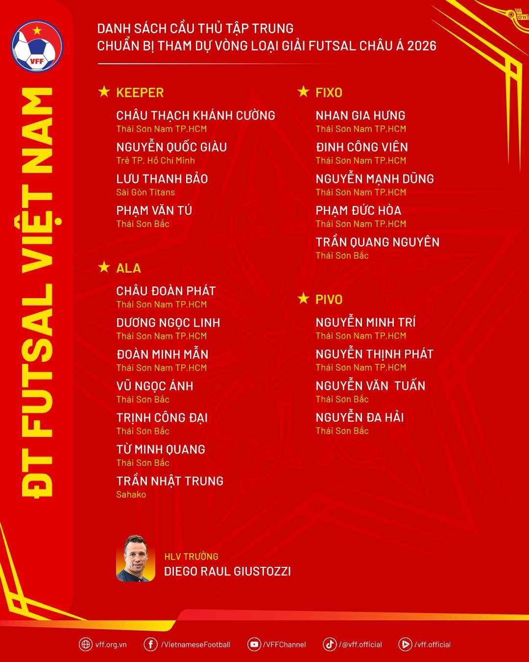 Ngày 15/8, HLV trưởng Diego Giustozzi đã chính thức công bố danh sách 20 cầu thủ được triệu tập vào đội tuyển futsal Việt Nam nhằm chuẩn bị cho Vòng loại futsal châu Á 2026. Lần tập trung này, lực lượng của đội tuyển hội tụ nhiều gương mặt giàu kinh nghiệm xen lẫn những tài năng trẻ triển vọng, hứa hẹn tạo nên sức cạnh tranh mạnh mẽ.