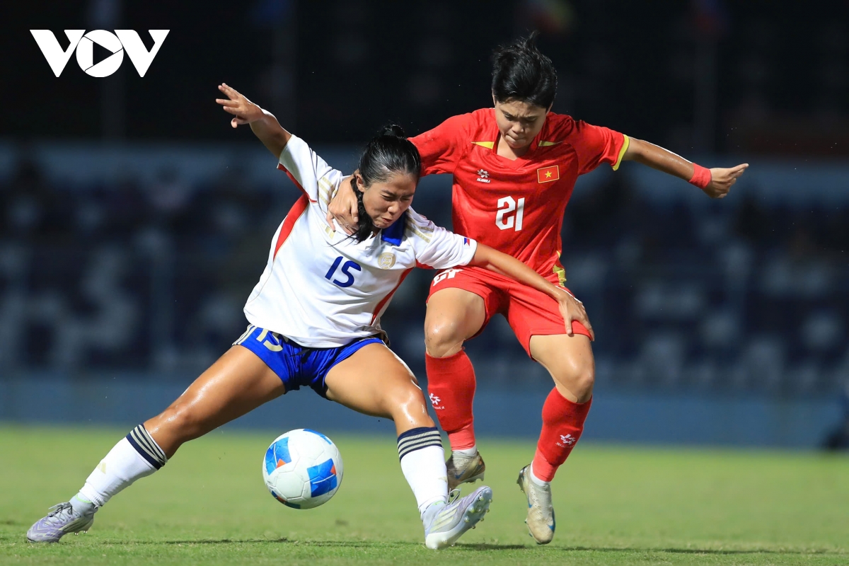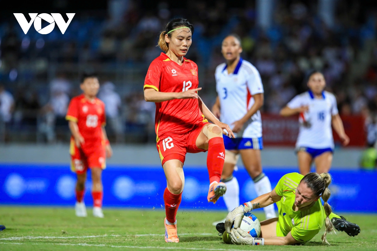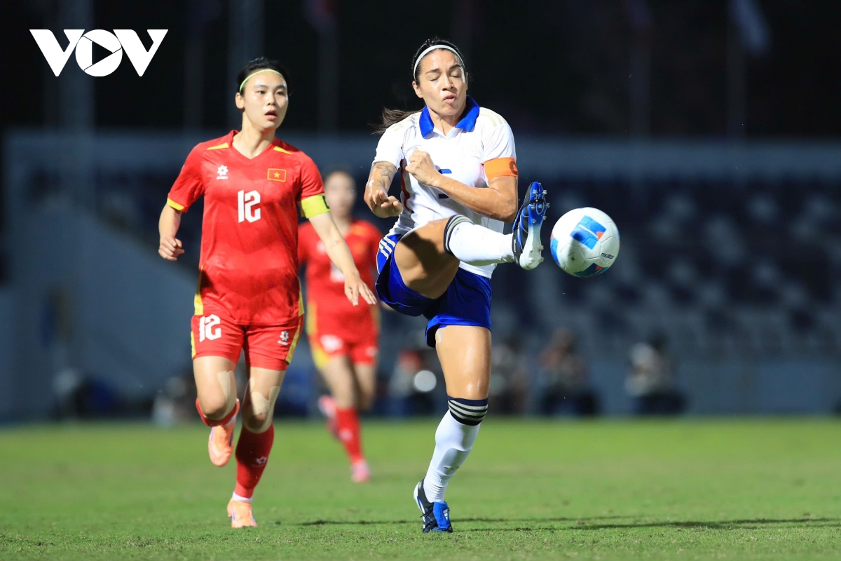 Trong hiệp một, cơ hội nguy hiểm nhất thuộc về ĐT nữ Việt Nam ở phút 29, khi Bích Thùy đánh đầu tung lưới Philippines.