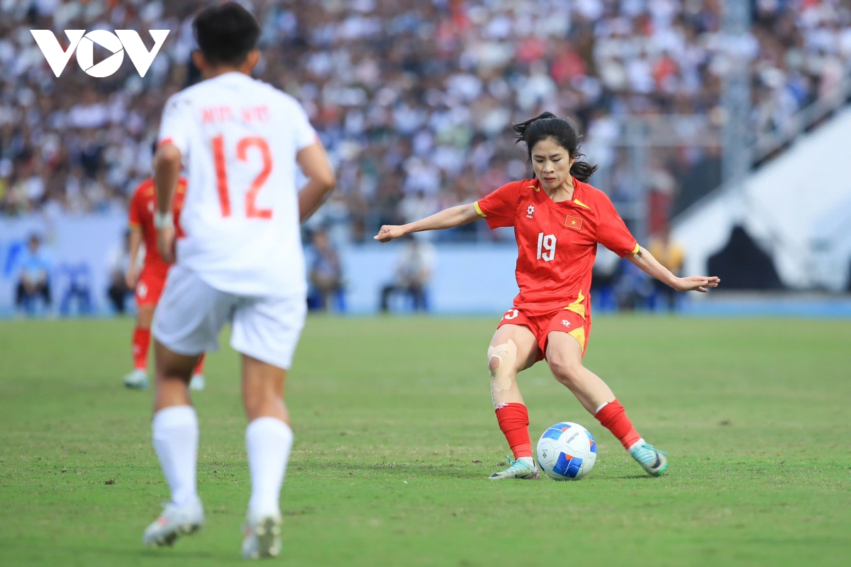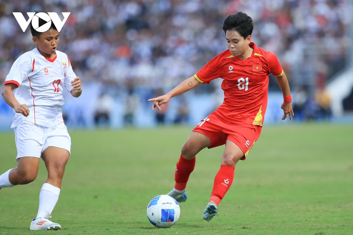 5 phút sau, Hoàng Thị Loan gây áp lực khiến hàng thủ Myanmar rối loạn. Cầu thủ áo trắng phá bóng trúng chân Loan bật vào xà ngang làm thủ môn đội bạn lúng túng. Bóng bật ra đúng vị trí Bích Thùy và tiền vệ này dễ dàng ghi bàn.
