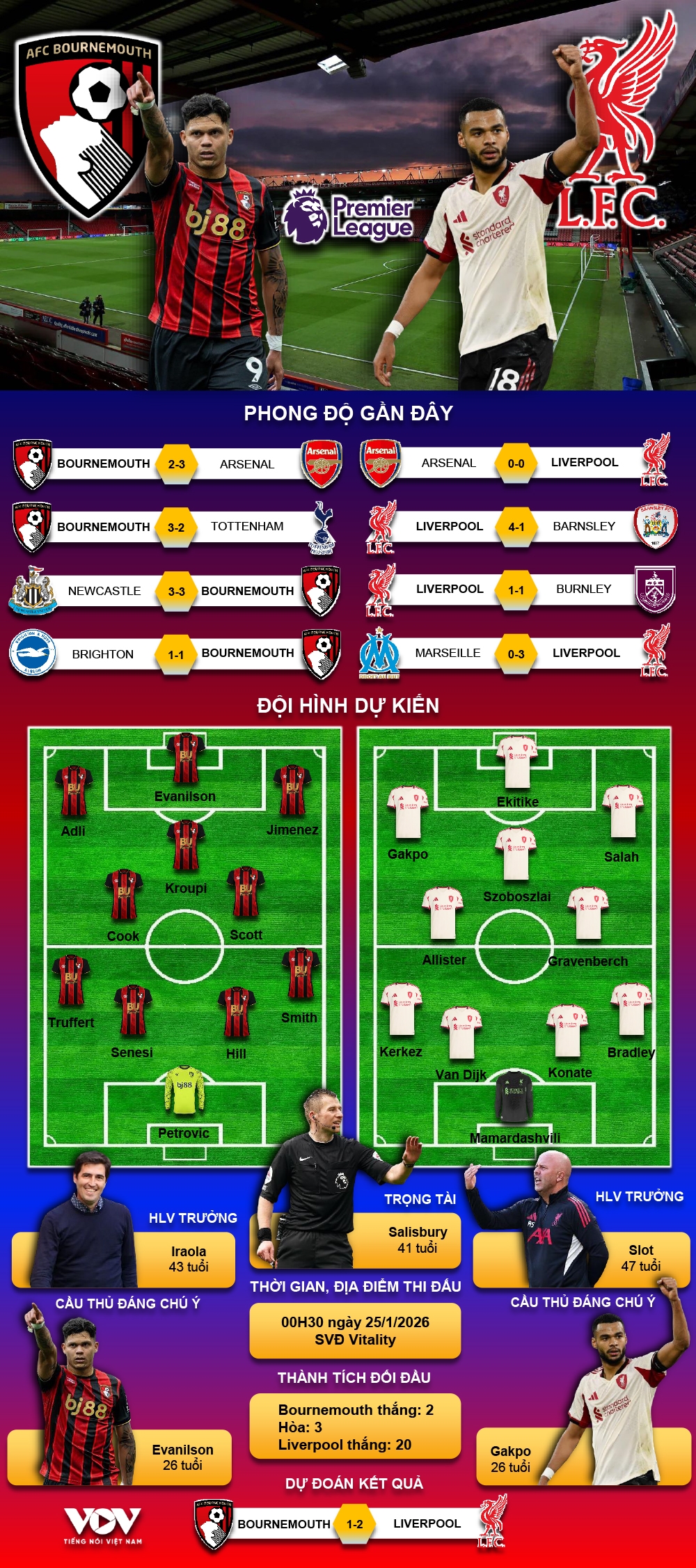 VOV.VN - Dự đoán kết quả và đội hình ra sân trận Bournemouth vs Liverpool thuộc khuôn khổ vòng 23 Ngoại hạng Anh 2025/2026 diễn ra lúc 00h30 ngày 25/1.