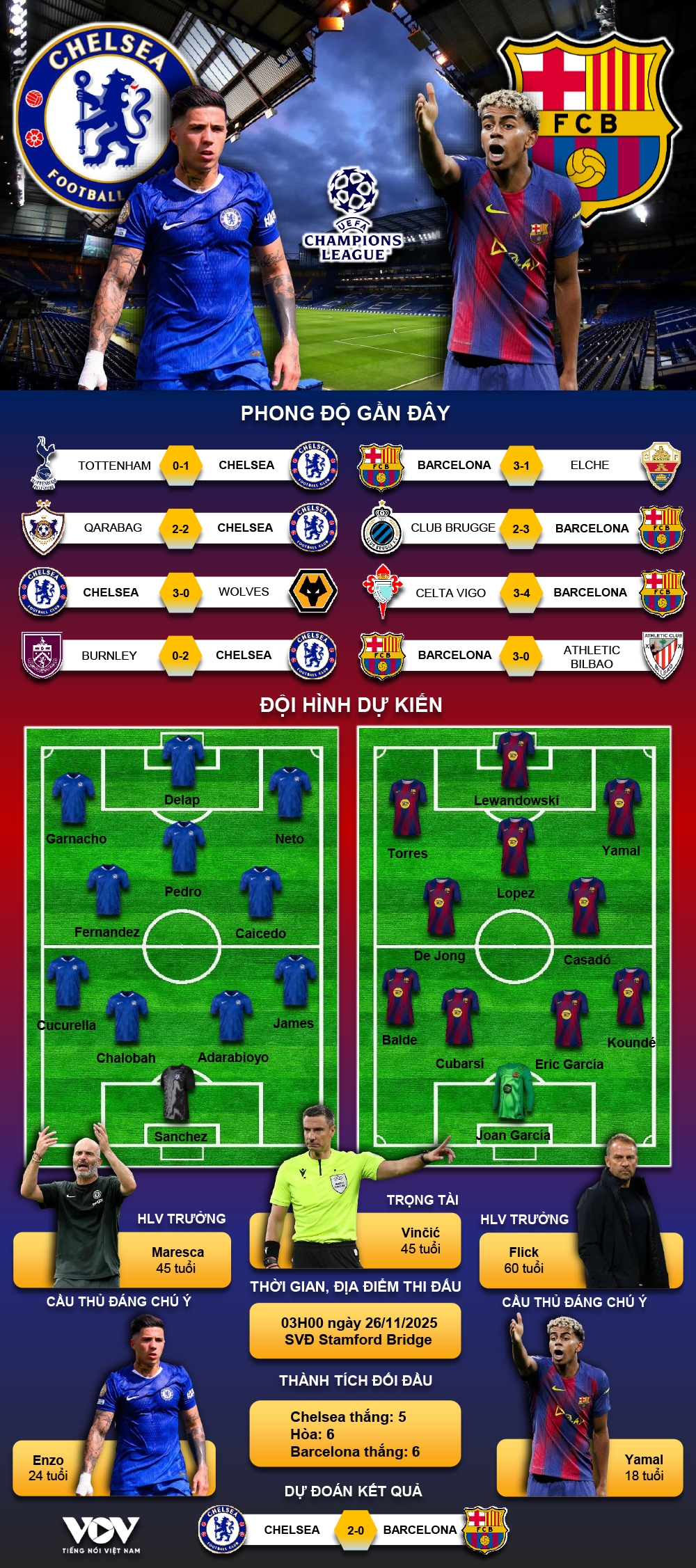 VOV.VN - Dự đoán kết quả và đội hình ra sân trận Chelsea vs Barcelona thuộc khuôn khổ lượt trận 5 vòng bảng Cúp C1 châu Âu diễn ra lúc 03h00 ngày 26/11.