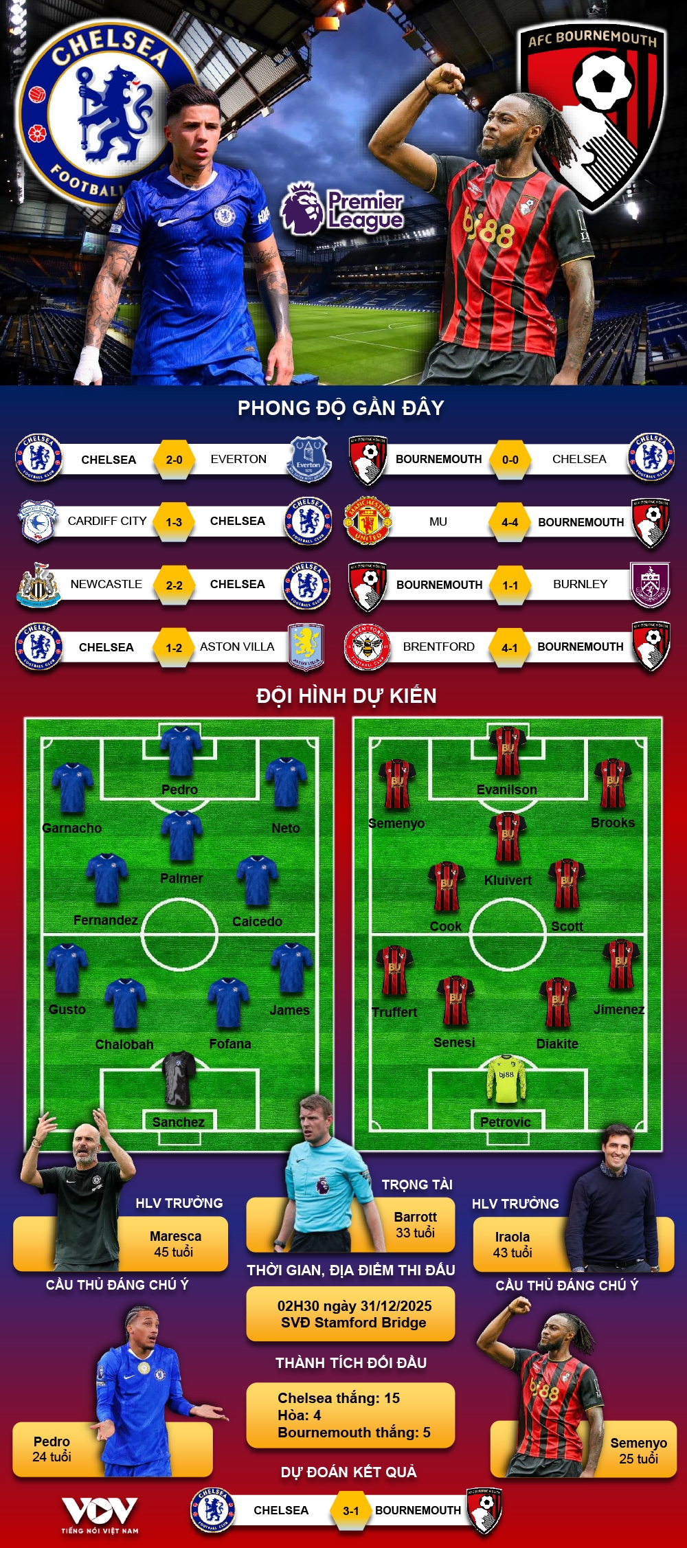 VOV.VN - Dự đoán kết quả và đội hình ra sân trận Chelsea vs Bournemouth thuộc khuôn khổ vòng 19 Ngoại hạng Anh 2025/2026 diễn ra lúc 02h30 ngày 31/12.