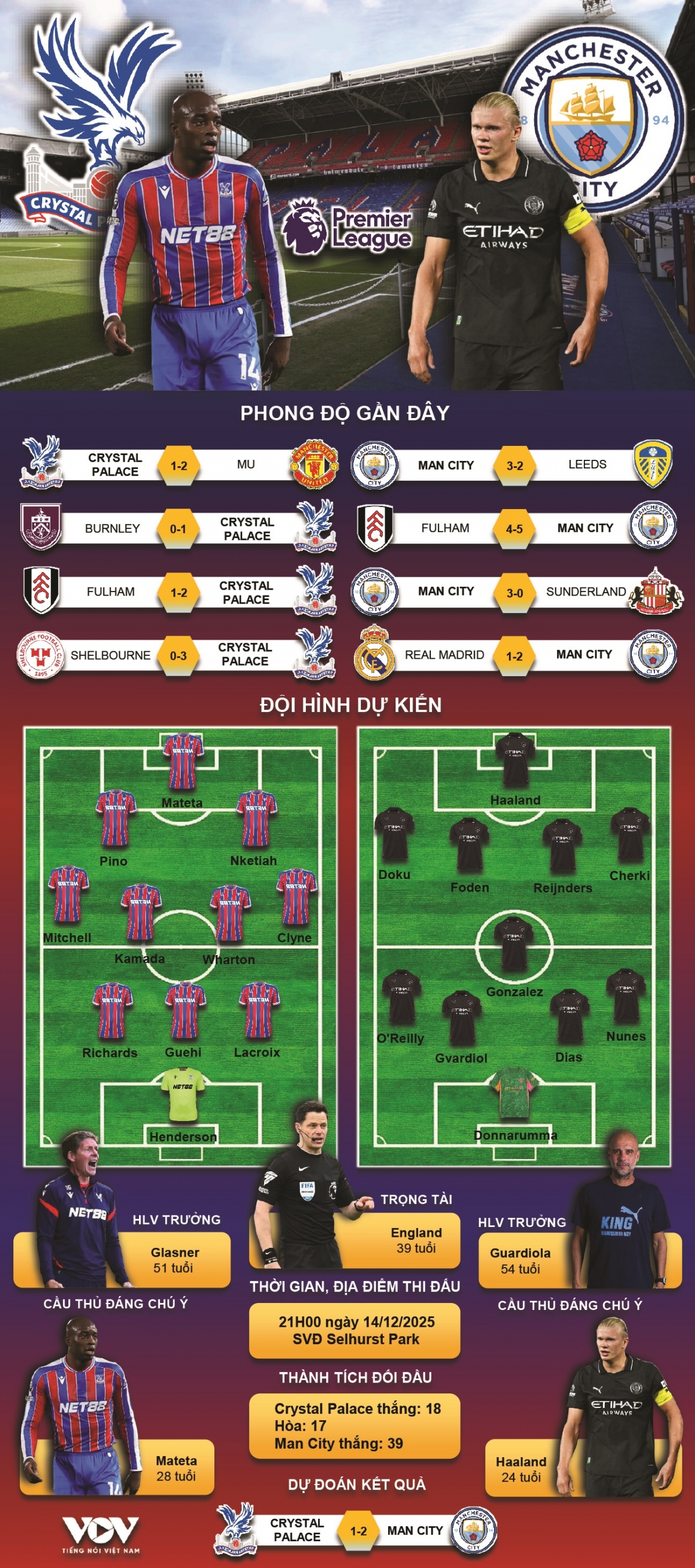 VOV.VN - Dự đoán kết quả và đội hình ra sân trận Crystal Palace vs Man City thuộc khuôn khổ vòng 16 Ngoại hạng Anh 2025/2026 diễn ra lúc 21h00 ngày 14/12.